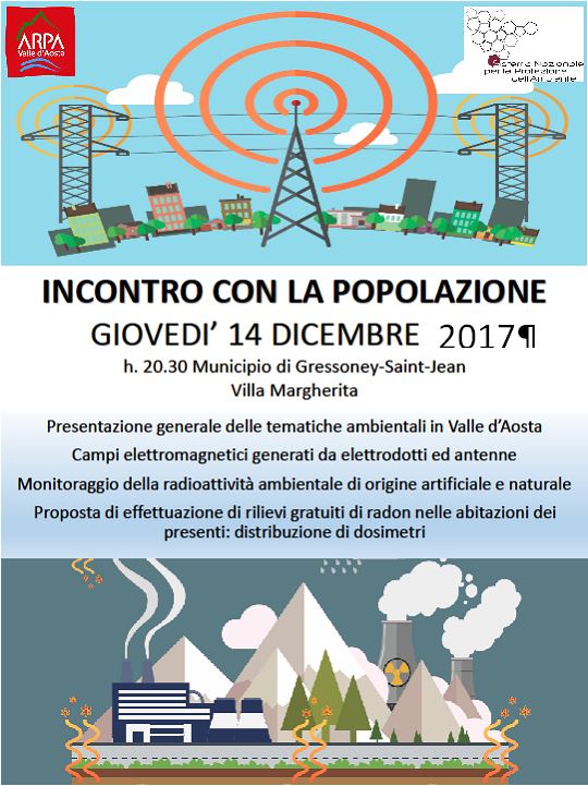 Presentazione generale delle tematiche ambientali in Valle d'Aosta, campi elettromagnetici generati da elettrodotti ed antenne, monitoraggio della radioattività ambientale di origine artificiale e naturale, proposta di effettuazione di rilievi gratuiti di radon nelle abitazioni dei presenti: distribuzione di dosimetri