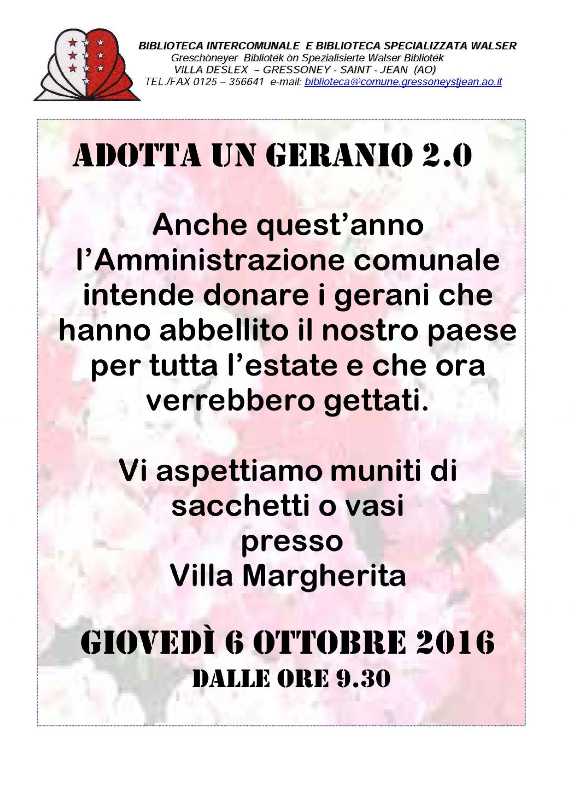 L' amministrazione comunale anche quest' anno propone l' iniziativa "Adotta un geranio", verranno regalate le piante di geranio che hanno abbellito il paese durante i mesi estivi; basta presentarsi con sacchetti o vasi GIOVEDI' 6 OTTOBRE dalle ore 9.30 presso VILLA MARGHERITA, sede dell' amministrazione comunale.