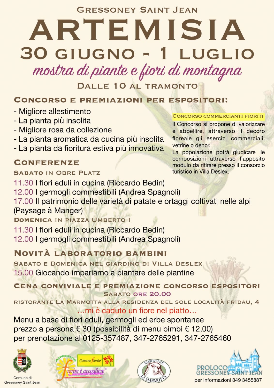 Questo è il ricco programma di Artemisia Gressoney che vi attende il 30 giugno e 1 Luglio ; oltre a trovare le piazze e le vie del centro storico di Gressoney Saint Jean, piene di fiori e piante di montagna, una serie di conferenze “open air” vi farà conoscere questo mondo. Gli appuntamenti in calendario sono: