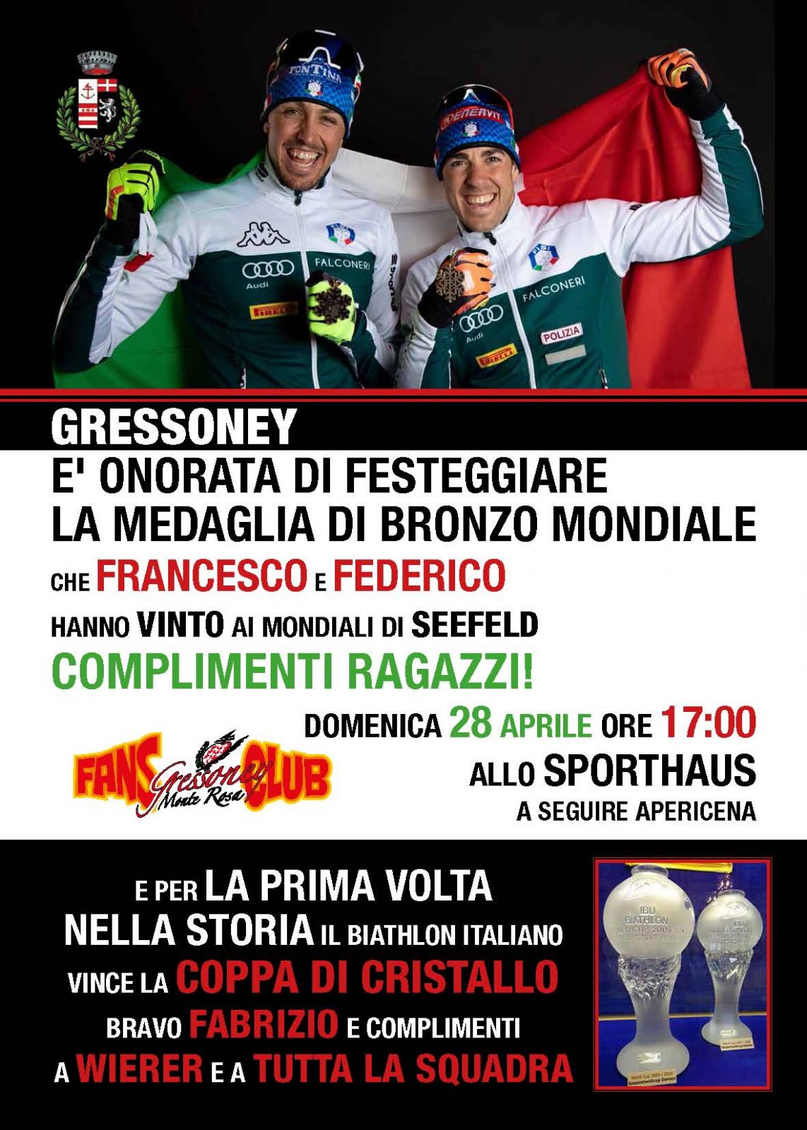 Domenica 28 Aprile, dalle ore 17.00 presso la SportHaus di Gressoney Saint Jean si festeggia la medaglia di bronzo mondiale di Francesco De Fabiani e Federico Pellegrino vinta ai mondiali di sci nordico di Seefeld
