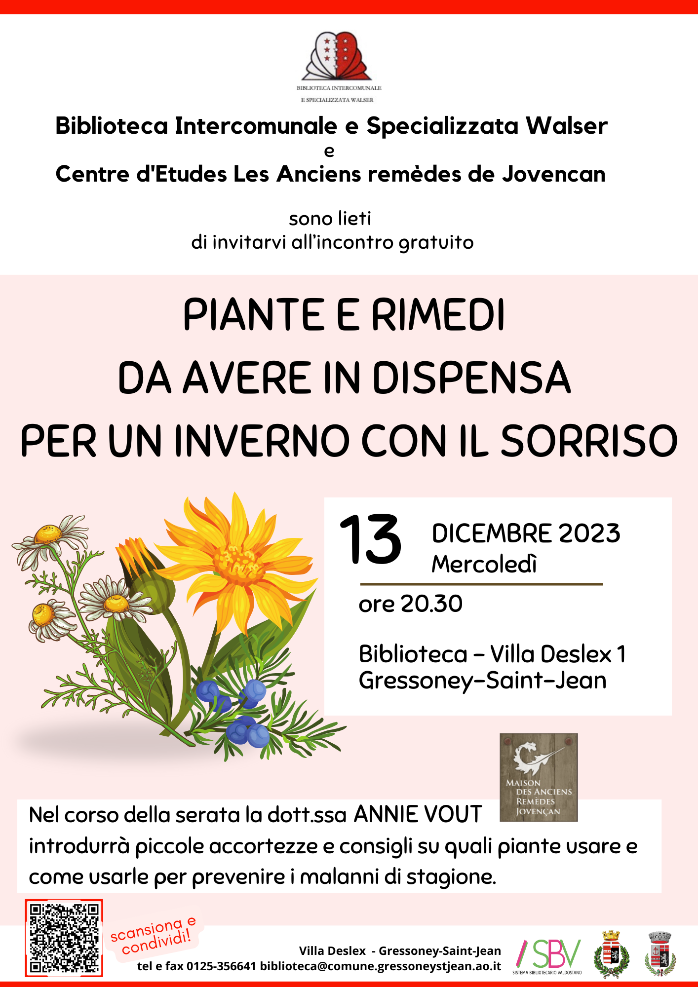 Incontro gratuito "Piante e rimedi da avere in dispensa per un inverno con il sorriso" presso la Biblioteca Intercomunale e Specializzata Walser, sita in Gressoney-Saint-Jean, Mercoledì 13 dicembre 2023 alle ore 20,30 con la dott.ssa Annie Vout