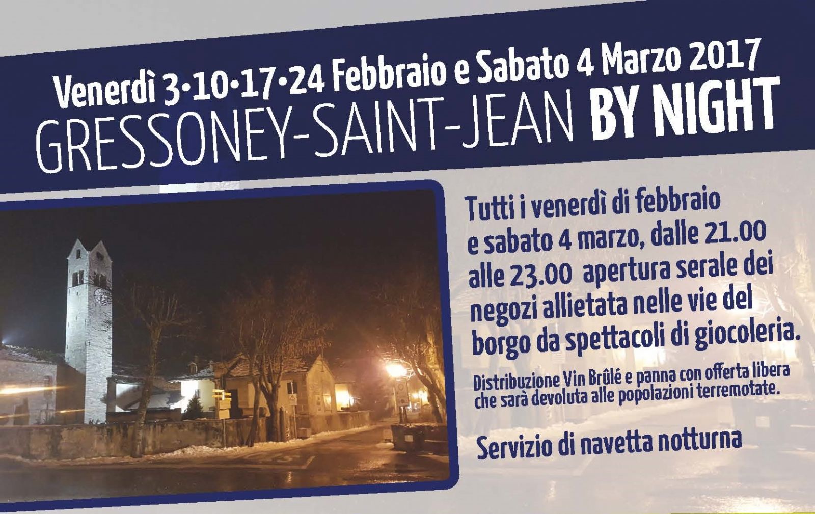 Sabato 4 Marzo, negozi aperti alla sera e animazione, nel Centro Storico di Gressoney Saint Jean. Servizio bus navetta notturno disponibile