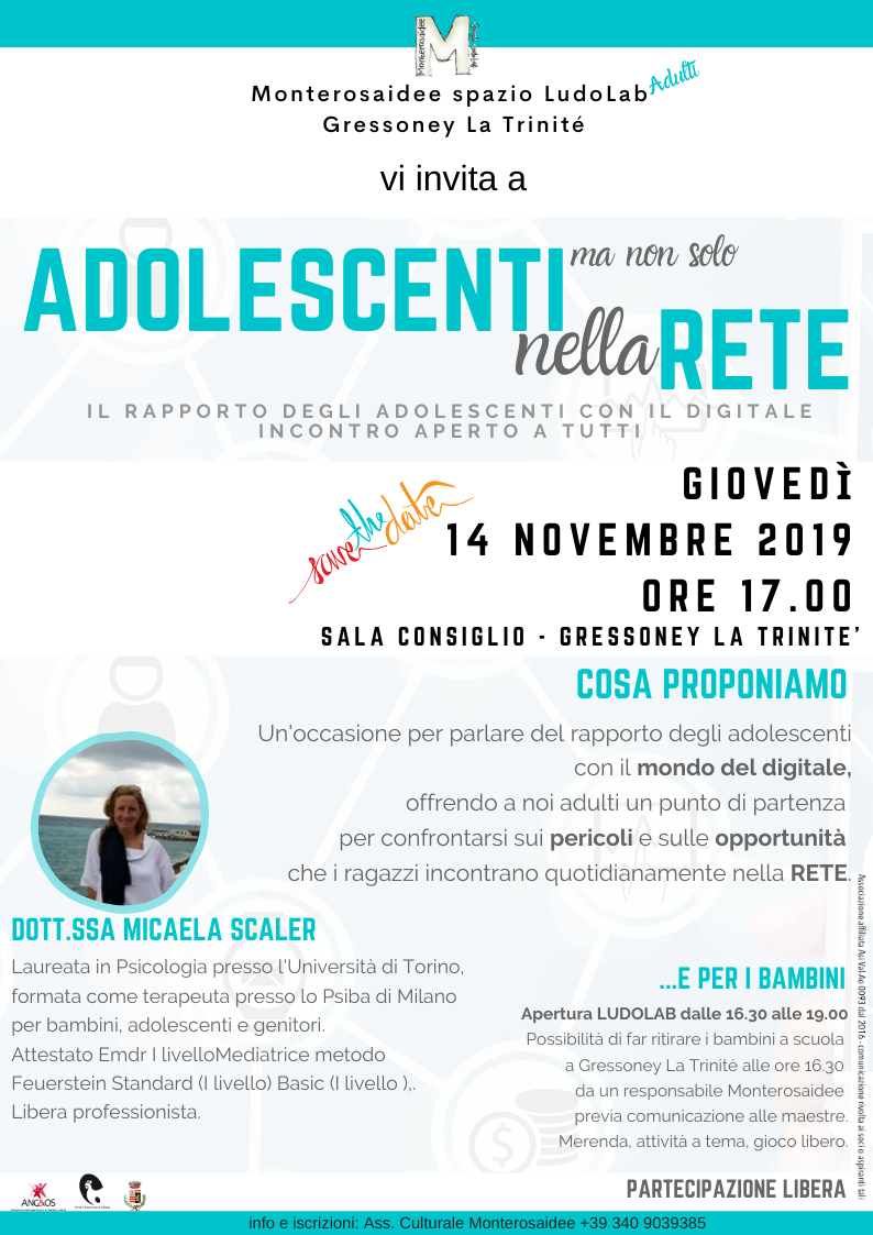 Incontro aperto a tutti per parlare del rapporto degli adolescenti con il digitale, offrendo agli adulti un punto di partenza per confrontarsi sui pericoli e sulle opportunità che i ragazzi incontrano quotidianamente nella rete.