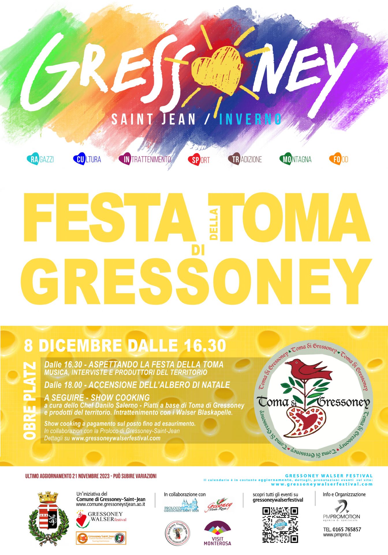 Dalle ore 18.00 accensione dell'albero di Natale in Piazza e a seguire Show Cooking* a cura dello Chef Danilo Salerno che proporrà piatti a base di Toma di Gressoney e prodotti locali.