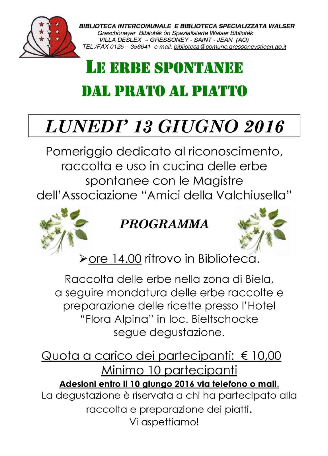 Pomeriggio dedicato al riconoscimento, raccolta e uso in cucina delle erbe spontanee con le Magistre dell’Associazione “Amici della Valchiusella”, promosso dalla Biblioteca Intercomunale