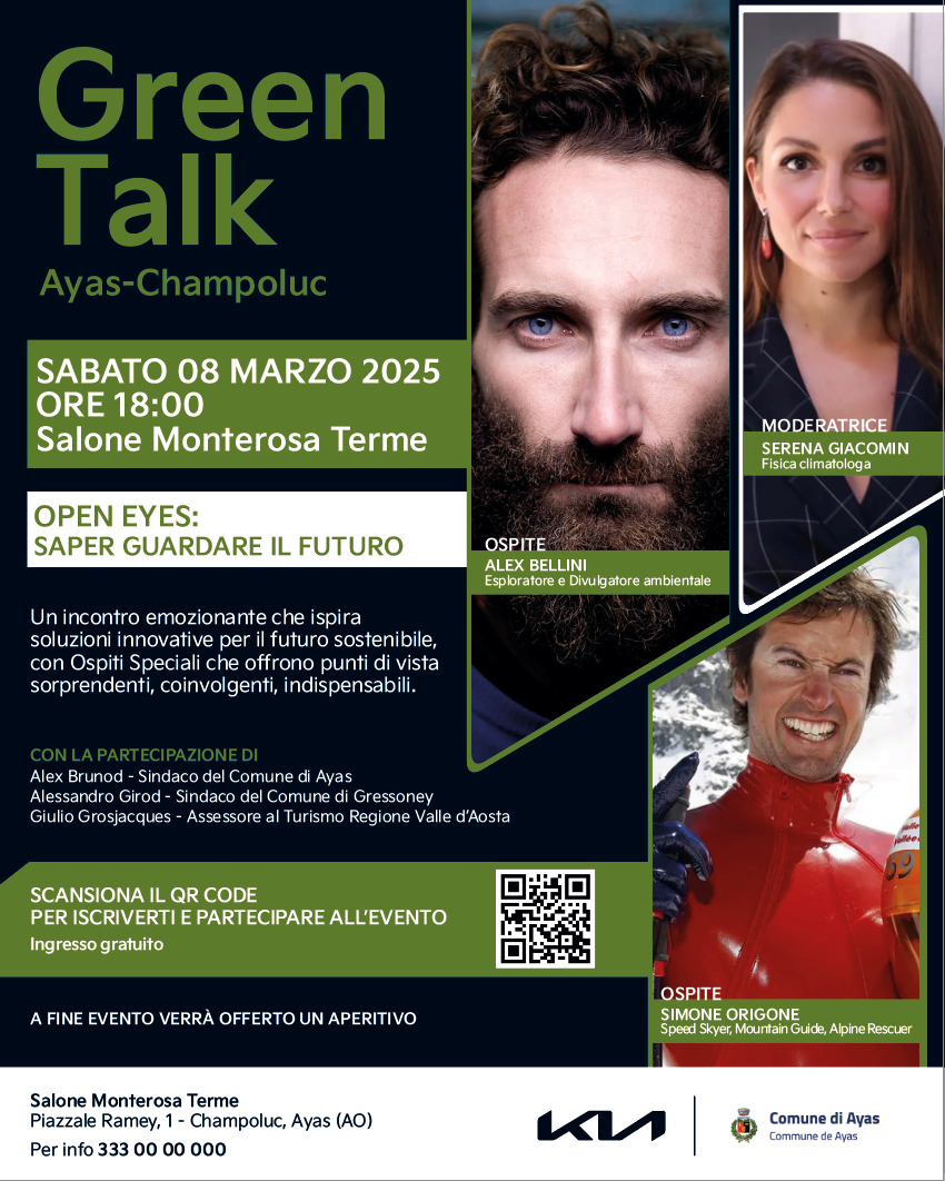 Sabato 8 marzo 2025 alle ore 18:00 presso il salone Monterosa Terme di Champoluc, si terrà l'incontro emozionante che ispira soluzioni innovative per il futuro sostenibile, con ospiti speciali che offrono punti di vista sorprendenti, coinvolgenti, indispensabili.