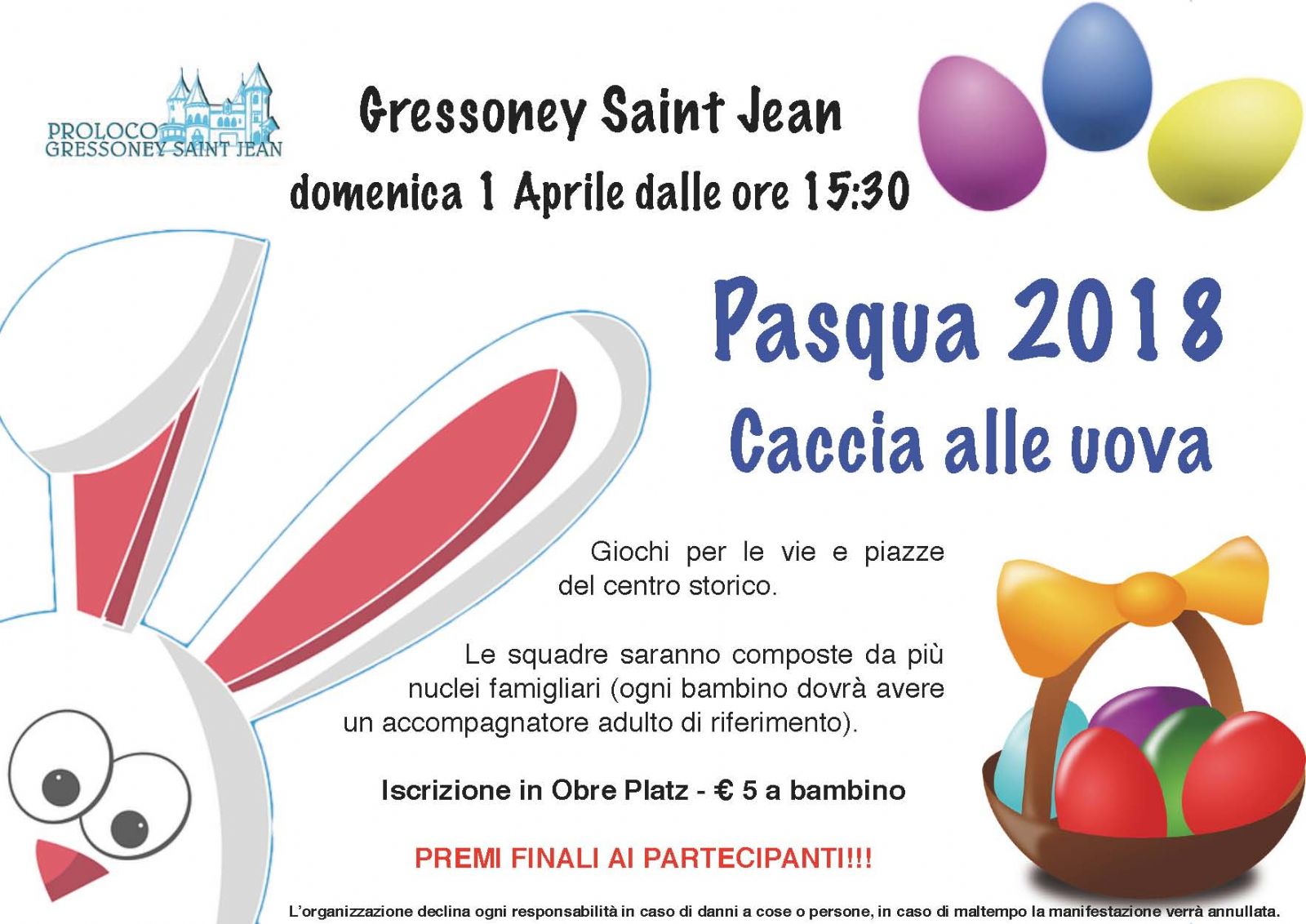 Domenica 1 aprile ti aspettiamo dalle 15.30, con la tua famiglia ed i tuoi amici, per “Caccia alle uova”, Forma la tua squadra per partecipare a divertenti giochi e prove per le vie e piazze del centro di Gressoney Saint Jean. Un modo divertente per passare la Domenica di Pasqua.