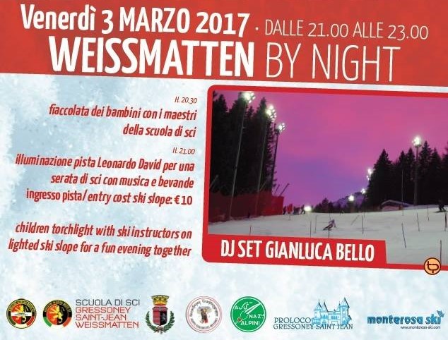 Venerdì 3 Marzo – Apertura pista Weissmatten in notturna, a Gressoney Saint Jean; dalle 20.30 Fiaccolata dei Maestri, musica diffusa per una serata speciale sci ai piedi